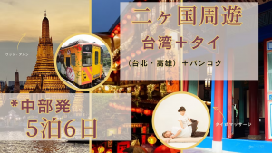 「台湾旅行とタイ旅行、どちらも行きたい!」そんな方におすすめなのが、台北経由バンコク旅行を含む二か国周遊プランです。台北や高雄では夜市や歴史的スポットを、バンコクやアユタヤでは寺院や世界遺産を体験。短期間でも効率よく観光・グルメ・文化を満喫できるのが魅力です。中部国際空港や関空や東京からのフライトを利用すれば、台北経由でバンコクにアクセスしながら、二か国を効率的に楽しめます!